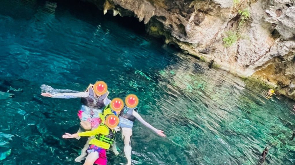 今回のオプショナルツアーでは、ガイドの方がとても親切で、家族写真をたくさん撮ってくれました。家族揃ってセノーテに浮いている写真などもお願いでき、よい思い出になりました。